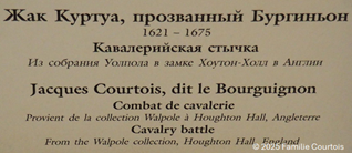 Interessant ist auch, wie unser Name in Sprachen übertragen wird, die nicht auf lateinischen Buchstaben beruhen, z.B. ins russische. Hier das Schildchen neben einem Gemälde von J. Courtois in der Eremitage in St. Petersburg: